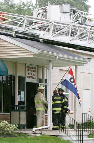 Firefighters talk outside the entrance to Allied Computer Brokers (A.C.B.) at 23 Noel St. in Amesbury while they fought a three-alarm fire on Thursday, September 3. Several fire departments from around the area helped the Amesbury Fire Department fight the fire.